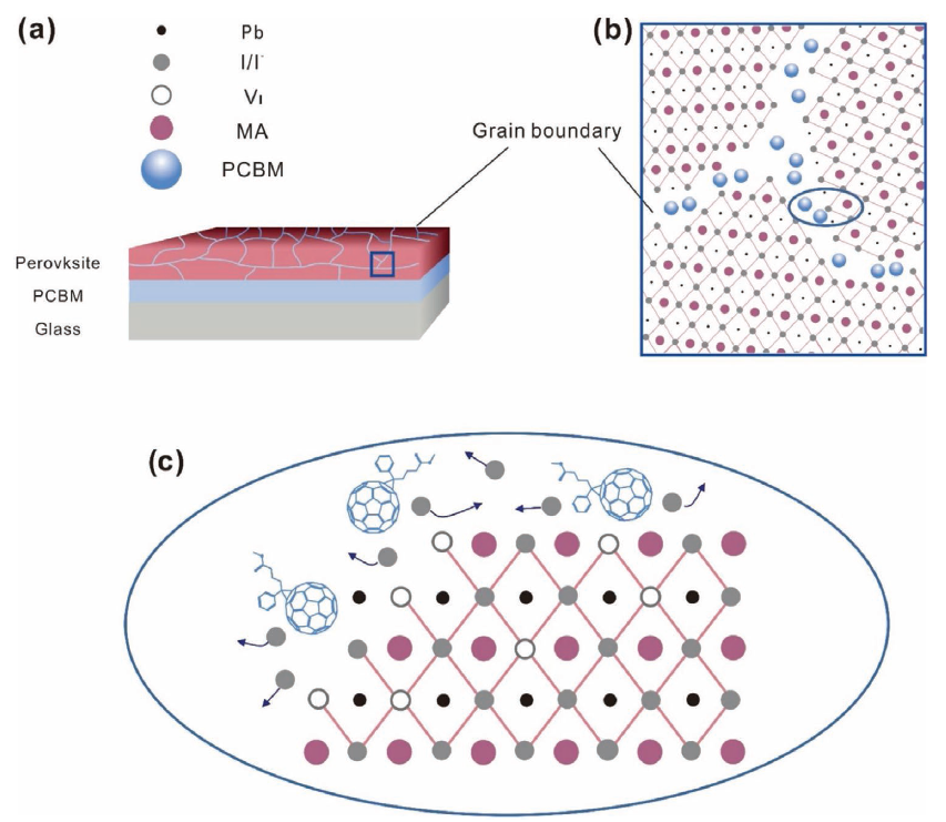 图2. PCBM钝化钙钛矿材料中缺陷的示意图。a)沉积在PCBM层上钙钛矿薄膜的示意图;b)是a)中矩形区域的放大图像,显示PCBM分子渗入钙钛矿层中的晶界;c)是b)中圆圈区域的放大图像,表明PCBM分子成为碘离子运动的障碍。