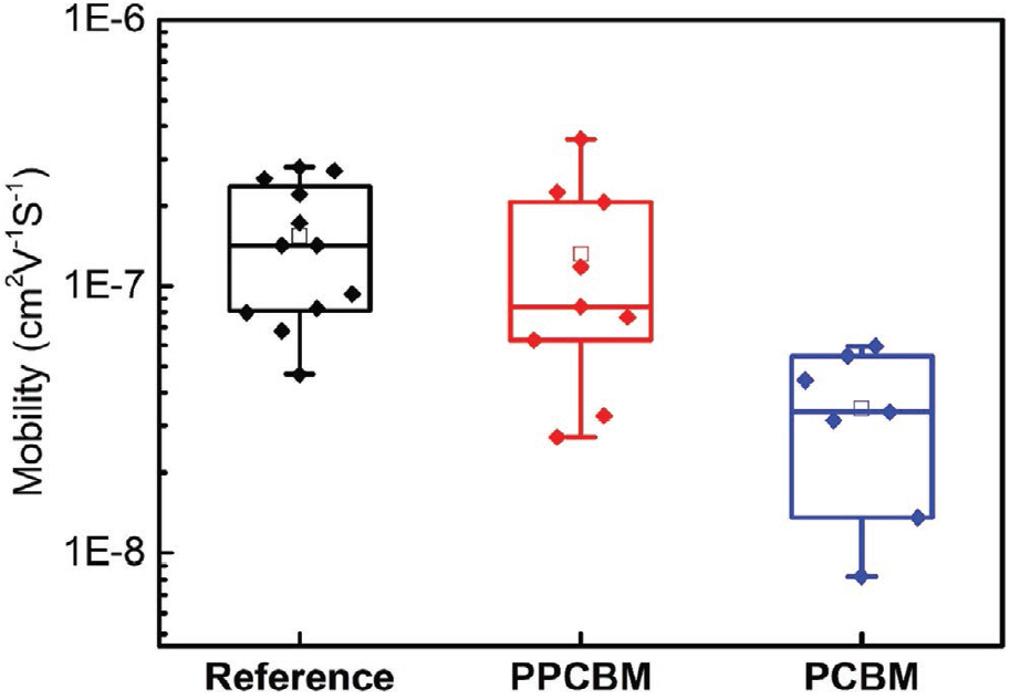 图1.钙钛矿薄膜中加入PCBM和PPCBM的离子迁移率比较。