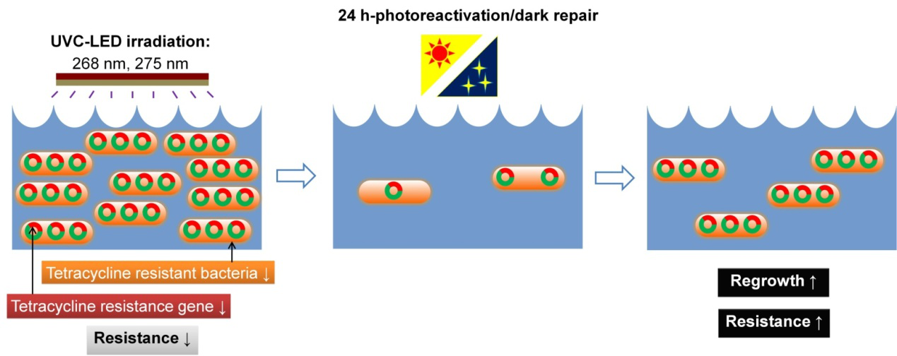 LED作为一种替代汞灯的新兴紫外光源,具有波长多样化、电力需求低等优点,在水消毒领域有着巨大的应用潜力。研究结果表明,波长268 nm的UVC-LED对耐药性芽孢杆菌的灭活效率可高达5.7log,同时能抑制抗性基因表达,降低耐药菌抗性,所需能量密度和处理非耐药菌接近。主要由于光致修复作用,UVC-LED辐照后的水体出现耐药菌再生并伴随抗性反弹现象,这与非耐药菌相似,也是今后LED光源设计时需要特别关注的地方。