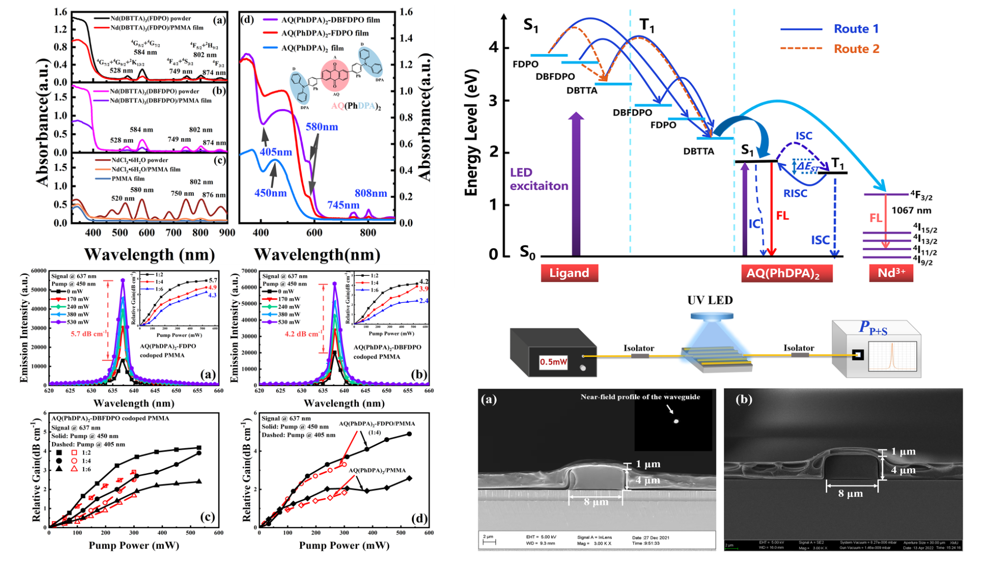 张丹教授团队与黑龙江大学化学化工与材料学院许辉教授团队合作,构建了两种含有二苯基膦氧基团DBFDPO、FDPO的钕配合物:Nd(DBTTA)3(DBFDPO)、Nd(DBTTA)3(FDPO),并将它们分别与热激发延迟荧光分子AQ(PhDPA)2共掺,通过有机配体与中心稀土钕离子的分子内能量传递、以及配体与AQ(PhDPA)2分子间的能量转移机制,实现了钕离子与AQ(PhDPA)2分子的同步高效发光;同时,采用与CMOS兼容的半导体工艺,制备了适合材料的倏逝波波导结合铝反射镜的器件,在一个价格低廉、低功率发光二极管(LED)泵浦下,实现了0.6 μm可见光和1.06 μm近红外光的同步光放大。