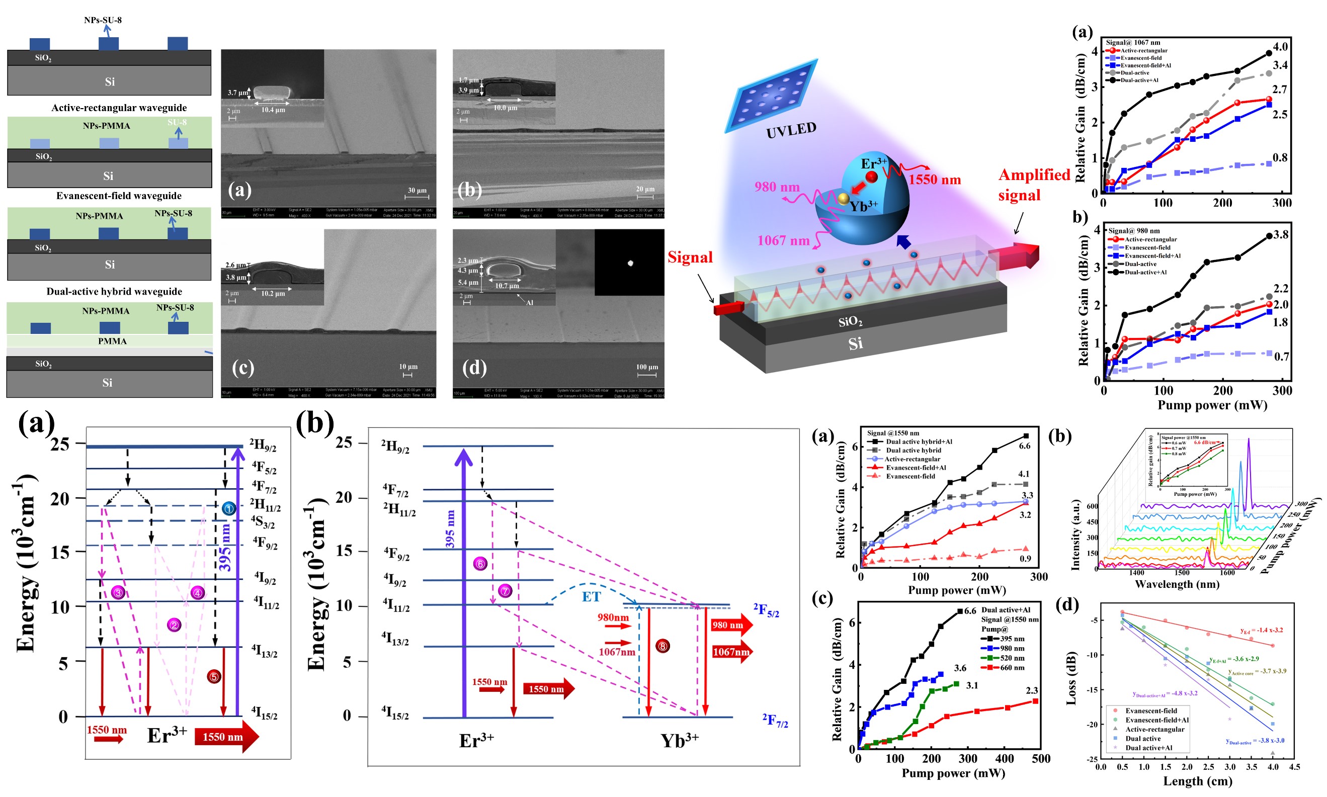 张丹教授团队将NaYF4:Er3+,Yb3+纳米颗粒掺杂到甲基丙烯酸甲酯等聚合物材料中,设计制备了有源矩形、倏逝波型、双有源复合型三种不同波导结构的器件,在一个低功率LED泵浦下,实现了1550、1067和980 nm三个近红外波长的光增益;并通过在器件上添加反射镜的方法,将波导的增益性能提高了2-3倍,其中,在截面尺寸为4×10μm2的双有源复合型结合反射镜的波导中,在上述三个波长处分别获得了6.6, 4.0, 3.8 dB/cm的增益,并详细阐明了蓝紫光LED泵浦下,Er3+离子向Yb3+离子的逆向能量传递以及量子切割过程。